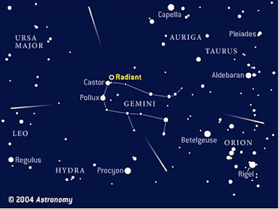 Meteor showers are named by the constellation from which meteors appear to fall, a spot in the sky astronomers call the radiant. For instance, the next meteor shower is the Geminids in the evening of December 13, 2008. This meteor shower gets the name "Geminids" because it appears to radiate from the constellation Gemini.